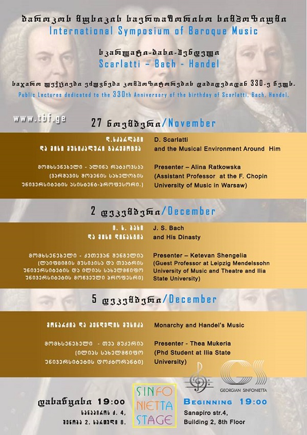 „თბილისის ბაროკო ფესტივალის“ ფარგლებში გაიმართება „ბაროკოს მუსიკის საერთაშორისო სიმპოზიუმი“, რომელიც ი.ს. ბახის, დ. სკარლატისა და გ.ფ. ჰენდელის საიუბილეო წელს ეძღვნება და შედგება სამი საჯარო ლექციისგან.