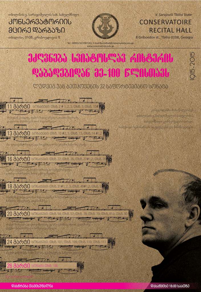11 დან 26 მარტის ჩათვლით თბილისის სახელმწიფო კონსერვატორიაში კონცერტების ციკლი გაიმართება, სადაც ლ. ვ. ბეთჰოვენის ყველა, 32 საფორტეპიანო სონატა შესრულდება. შვიდი კონცერტი კონსერვატორიის მცირე დარბაზში ჩატარდება და მასში კონსერვატორიის სტუდენტები და სამუსიკო სემინარიის ორი მოსწავლე მონაწილეობს. დასკვნით, მე-7 კონცერტზე ბეთჰოვენის ყველაზე ხანგრძლივი 29-ე სონატა აჟღერდება, რომელსაც მსმენელი ეკრანზე ს. რიხტერის შესრულებით მოისმენს.